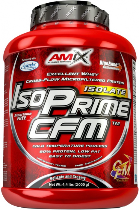 Amix IsoPrime CFM Whey Protein Isolate 2000 g – obsahuje 90% čistého proteinu (syrovátkový bílkovinný izolát) vyrobeného tou nejšetrnější metodou mikrofiltrace CFM®, tato metoda zaručuje maximální čistotu, lehkou stravitelnost a tu nejvyšší biologickou