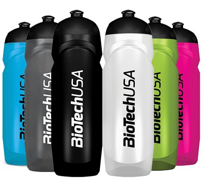 Moderní sportovní láhev s odměrkou a šroubovacím uzávěrem.