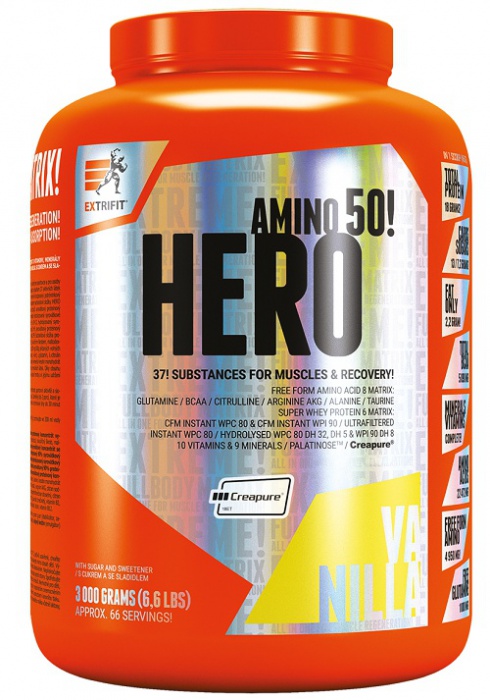 Extrifit Hero 3000 g nastartuje regeneraci a obnovu svalové hmoty ihned po dokončení tréninkové jednotky. Obsahuje vůbec nejširší spektrum nutných účinných potréninkových substancí ve vysokých dávkách.