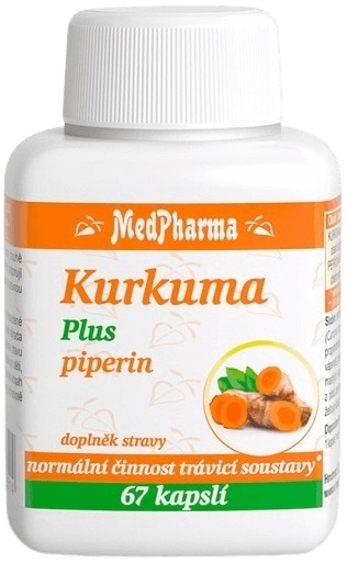 Kurkuma plus piperin je doplněk stravy ve formě kapslí obsahující Kurkumu dlouhou a piperin (extrakt z pepře)
