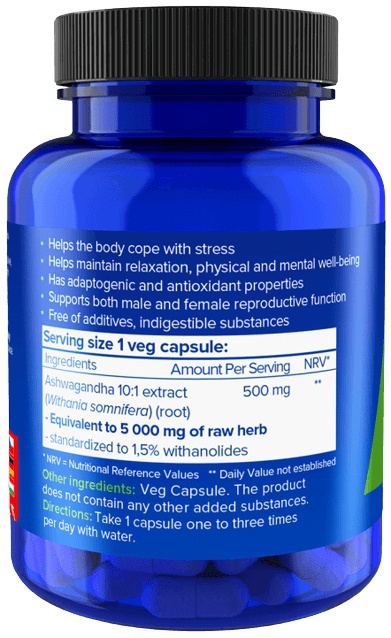 Každá kapsle o koncentraci 10:1, což znamená, z 5000 mg kořene Ashwagandhy bylo získáno 500 mg čistého a účinného extraktu