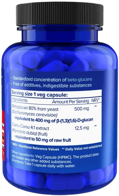 Jedinečný doplněk stravy, který kombinuje silné imunitní účinky betaglukanů s přirozeně vysokým obsahem vitaminu C z plodů Camu Camu.