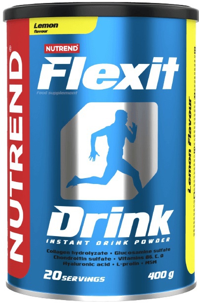 Nutrend Flexit Drink 400g – Kloubní výživa s komplexním složením. Obsahuje glukosamin sulfát, chondrotin sulfát, kolagenní bílkoviny a peptidy, aminokyseliny, MSM, kyselinu hyaluronovou. Najdeme látky bránící vzniku osteoporózy: vápník, hořčík, vitaminy.