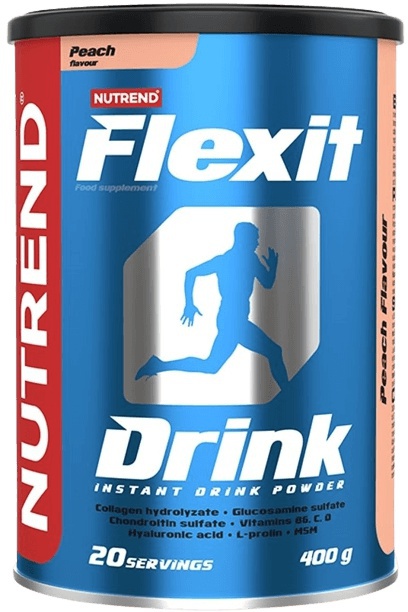 Nutrend Flexit Drink 400g – Kloubní výživa s komplexním složením. Obsahuje glukosamin sulfát, chondrotin sulfát, kolagenní bílkoviny a peptidy, aminokyseliny, MSM, kyselinu hyaluronovou. Najdeme látky bránící vzniku osteoporózy: vápník, hořčík, vitaminy.