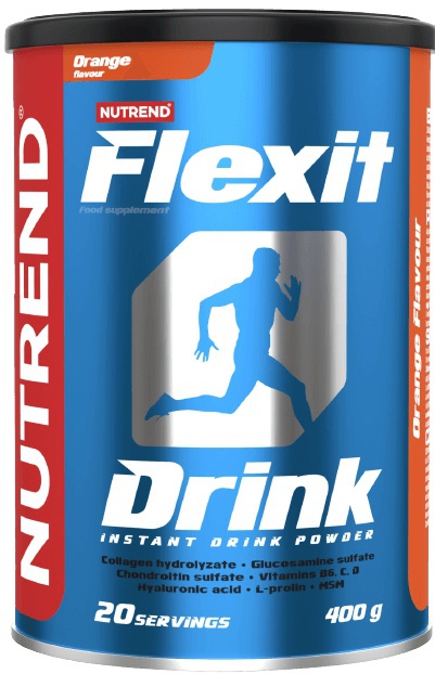 Nutrend Flexit Drink 400g – Kloubní výživa s komplexním složením. Obsahuje glukosamin sulfát, chondrotin sulfát, kolagenní bílkoviny a peptidy, aminokyseliny, MSM, kyselinu hyaluronovou. Najdeme látky bránící vzniku osteoporózy: vápník, hořčík, vitaminy.