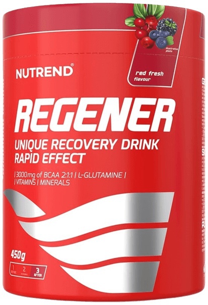 Nutrend Regener 450g – Speciální regenerační formule určená pro vyčerpaný organismus po fyzickém výkonu. S přídavkem funkčních látek – BCAA, L-Glutamínu, L-Argininu, L-Carnitinu, extraktu z Ginkgo biloba a vitamínů.