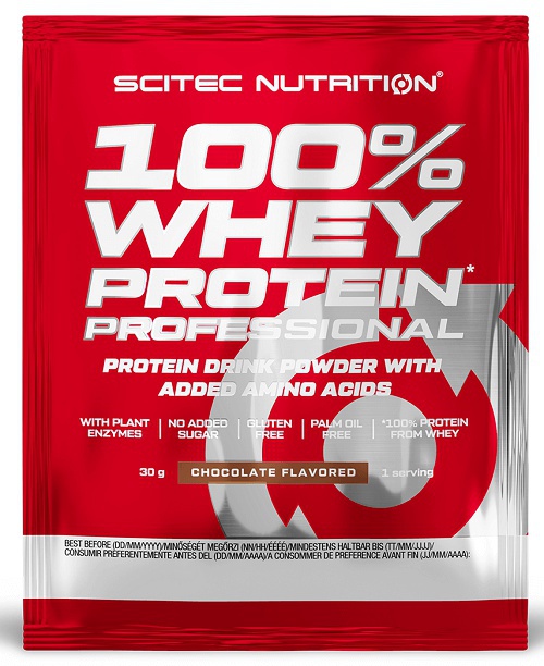 Scitec Nutrition 100% Whey Protein Professional 30g – prvotřídní 100% syrovátkový protein ( syrovátkový koncentrát a syrovátkový isolát) s obsahem cca 73% bílkovin, s přídavkem nezbytných aminokyselin a trávících Enzymů