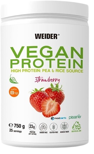 Weider Vegan Protein 750 g – vhodný pro vegetariány a vegany, obsahuje výhradně rostlinné bílkoviny. S přírodním sladidlem (stévií). Bílkoviny přispívají k růstu a udržení svalové hmoty.