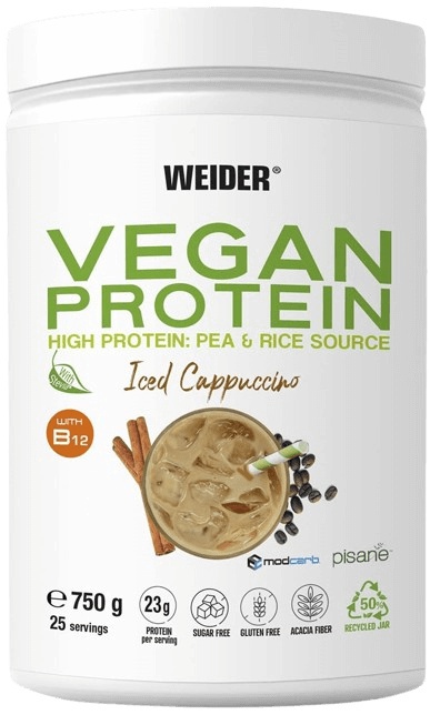 Weider Vegan Protein 750 g – vhodný pro vegetariány a vegany, obsahuje výhradně rostlinné bílkoviny. S přírodním sladidlem (stévií). Bílkoviny přispívají k růstu a udržení svalové hmoty.